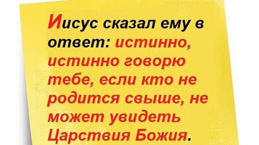 Евангелие от Иоанна. Глава 3. 1 Между фарисеями был некто, именем Никодим, один из начальников Иудейских. 2 Он пришел к Иисусу ночью и сказал Ему: Равви! мы знаем, что Ты учитель, пришедший от Бога; ибо таких чудес, какие Ты творишь, никто не может творить, если не будет с ним Бог. 3 Иисус сказал ему в ответ: истинно, истинно говорю тебе, если кто не родится свыше, не может увидеть Царствия Божия. 4 Никодим говорит Ему: как может человек родиться, будучи стар? неужели может он в другой раз войти...