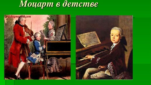 Уже в возрасте 3-х лет Моцарт подбирал на клавесине терции и сексты. В 4 года он написал 1-й концерт для клавесина, такой сложный, что вряд ли кто из европейских виртуозов тех лет мог бы его исполнить. В 4-летнем возрасте Моцарт моментально запоминал маленькие музыкальные пьесы, которые исполняла его старшая сестра, и воспроизводил их на клавесине (он обладал феноменальным музыкальным слухом и памятью). В 5 лет он начал сочинять несложные менуэты. К 6 годам юный Моцарт уже прекрасно играл на клавесине, органе и скрипке сложнейшие произведения...