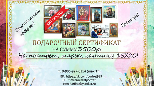 Всех приветствую, друзей и гостей моего канала! Не знаете, что подарить на День рождения, Юбилей, на Свадьбу, 23 февраля, 8 марта, коллегам по работе, директору, любимым и близким, своим друзьям и себе? Нет времени на поиски подарка, который вызывает полный восторг и восхищение? А подарите Сертификат на выполнение портрета или любых картин на заказ. Сертификат подарить можете сейчас, а получатель может заказать искусство в любое время в течении 6 месяцев с момента вручения такого подарка. От 3 шт...
