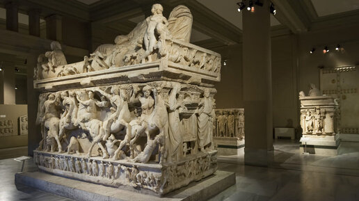 Саркофаг Сидамары (Стамбульский археологический музей): он был найден в деревне Амбар на дороге Конья-Эрегли Караман и доставлен в Археологические музеи Стамбула в 1901 году. Саркофаг датируется периодом между вторым и третьим веками нашей эры и известен как самый тяжелый саркофаг. в мире при его весе 32 тонны. На саркофаге две фигуры Эроса, а на другой длинной стороне саркофага изображена сцена охоты. Саркофаг плакальщиц (Стамбульский археологический музей): Он был найден при раскопках Османа Хамди-бея в некрополе царя Сидона в Ливане в 1887 году...