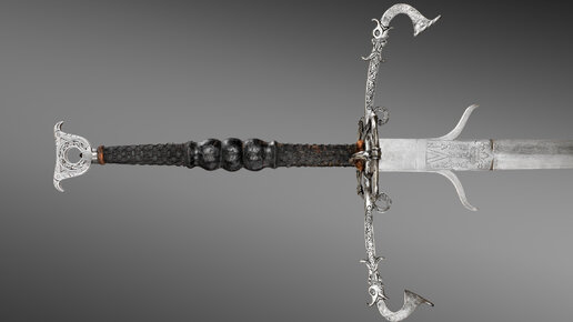 Иной раз, при виде особенно разлапистых двуручных мечей в музее возникает вопрос — они что, и правда были такие, или все это — производство 19 века, плод моды на мечи на стенах и доспехи вдоль стен? Тем более, что ряд подобных выставлен с отметкой вроде "Германия, 19 век, копия/имитация". А датированные мечи рядом из Испании и Северной Италии имеют весьма функциональный вид. Длина 1683 мм; клинок 1264 мм; перекрестье 352 мм; рукоять 413 мм; вес примерно 2200 граммов. Оружие может быть и не боевое, а стражи какого-то важного лица, но для боя вполне пригодное...