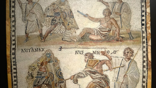 Мозаика III век н. э. изготовлена из кусочков мрамора и известняка, собранных в технике opus vermiculatum. Изображение делится на две части. В нижней сцене изображен начальный момент поединка между секутором Астианаксом и ретиарием Календионом...