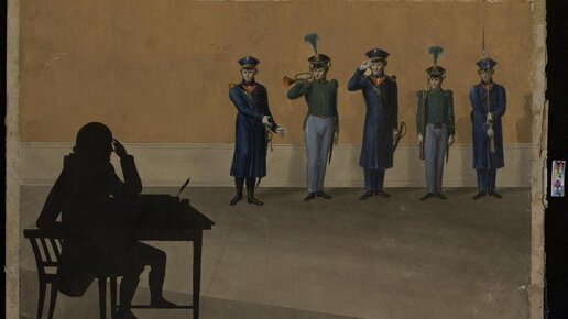 В Государственном историческом музее (ГИМ) в Москве хранится загадочная картинка, имеющая следующую аннотацию: «Рисунок с изображением сцены представления военных неизвестному». Датируется картинка первой четвертью XIX в., материал/техника - бумага, картон, акварель, тушь, белила. Рисунок меня крайне заинтриговал, очень захотелось разобраться, кто все эти люди и что вообще здесь происходит. Итак, представляется, нам нужно понять три взаимосвязанных вещи: что за сцена изображена на картинке, когда...