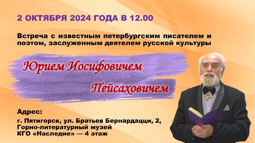 Данный текст опубликован на личной стр. Ю.И.Пейсаховича: https://vk.com/valia1410?from=search "Находясь в туристической поездке на Большой Кавказ, мы получили приглашение на Творческую Встречу от Союза Деятелей Культуры и Искусства с Кавказским Горным Обществом и студентами Лингвистического Института Пятигорского Госуниверситета, чему очень обрадовались в предвкушении, может быть, самого интересного в пути мероприятия, которое безусловно для нас было высокой честью и ответственности...