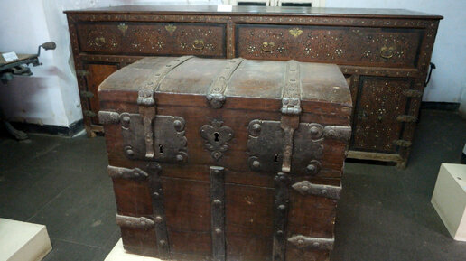 Пока гуляли по городу Панаджи случайно зашли в музей. Вход бесплатный, но нужно записаться в журнал - из какой страны прилетели, в каком отеле живем, телефон и т.д. Экспозиция начинается еще на улице. Довольно большие якоря. И огромные фонари. Внутри очень небольшая, но вполне приличная коллекция. Конечно есть артефакты португальского происхождения. Вот носилки для святынь. Но в основном вся европейская коллекция - это мебель. Самое конечно интересное в этой части - эти экспонаты Мы так долго рассматривали...