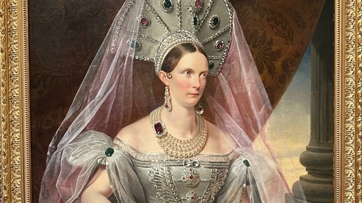 В Историческом музее (на Красной площади) хранится немало портретов известнейших людей России. Покажу Вам те, что привлекли мое внимание. Ведь на них мы можем увидеть крайне интересные детали. Вот почему императрица позирует в роскошном платье, но держит в руках скромные васильки? Зачем маленького цесаревича усадили у края балкона? А княжна позирует в ночной рубашке с котом на руках? Давайте разбираться. Этот портрет Александры Федоровны, супруги Николая I, cоздал Франц Крюгер в 1857 году. Что видите необычного в ее облике? Да, на ней надет роскошный кокошник...