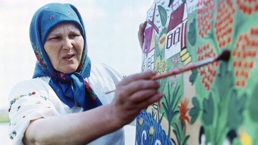 Мария Авксентьевна Примаченко — одна из ярчайших представительниц "наивного искусства", всю свою жизнь прожившая в с.Болотня (Украина) и там же творившая. Отец ее был плотником-виртуозом, мама виртуозно же вышивала, так что талант не взялся у нее из ниоткуда. Вся семья была талантлива по-своему. В детстве Мария перенесла полиомиелит, ей позже сделали протез, чтобы выровнять здоровую и больную ноги, из-за этого она всю жизнь носила длинные юбки. "Начиналось всё это так. Как-то около хаты, у речки, на убранном цветами лугу пасла я гусей...