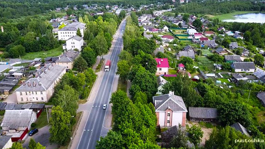 Всем привет! Сегодня предлагаю вам узнать о самом молодом городе Псковской области, который называется Пустошка. Вот она с высоты птичьего полета: В отличие от какого-нибудь Верхненовокутлумбетьево, с происхождением названия Пустошки все более-менее понятно - здесь когда-то ничего не было, пустота. Территория ровная, много озер: Главная причина появления города в этом месте представлена на следующей картинке: Это пересечение дорог Москва-Рига и Санкт-Петербург-Киев. Географическое положение на перекрестке важных путей всегда считается выгодным...