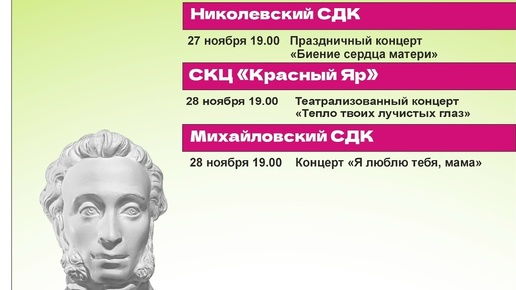 Экскурсии, спектакли и праздничные концерты ко Дню матери — выбирайте мероприятия для посещения по государственной программе Школьники и студенты от 14 до 22 лет могут бесплатно посещать культурные мероприятия с помощью Пушкинской карты в рамках нацпроекта «Семья». Об этом сообщили в Управлении культуры и искусства Уфимского района. С 24 по 30 ноября 2025 года запланированы экскурсии, спектакли и праздничные концерты ко Дню матери в Уфимском районе: - экскурсия «История в каждом предмете» в Юматовском музее 26 и 28 ноября в 16...