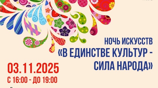 Ночь искусств в Ачинске: Искусство объединяет! 🎭🎨✨ 3 и 4 ноября всероссийская акция дойдет до нашего города! Готовьтесь погрузиться в мир творчества, истории и дружбы народов. Что вас ждёт: 🏛 Ачинский краеведческий музей (3 ноября 16.00-19.00) Поэтично-песенные серенады, лепка пельменей, настольные игры народов России, таинственные экскурсии «Путь к Победе!», «В сумерках», «По темноте» и уютная чайная церемония. 📚 Юношеская библиотека (микрорайон 5, дом 10) (3 ноября 20...