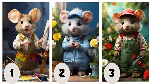 В мире психологических тестов существует безграничное поле для фантазии и творчества. Сегодня мы предлагаем вам погрузиться в увлекательное приключение самооткрытия с помощью необычного теста, который заигрывает с вашим восприятием и интуицией. Ниже перед вами предстает изображение с тремя мышонками, каждый из которых символизирует уникальный набор качеств и талантов. Выберите того, кто больше всего привлек ваше внимание, и мы раскроем, какой скрытый талант живет внутри вас. Напоминаем, этот тест создан для развлечения и самопознания, так что отнеситесь к результатам с легкостью и юмором...