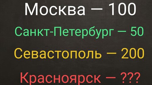 Интересную головоломку прислал один из подписчиков. Москва — 100; Санкт-Петербург — 50; Севастополь — 200; чему равен Красноярск? Если я не ошибаюсь, то этот же вопрос (возможно, вместо Севастополя был какой-то другой город) был когда-то задан на игре "Что? Где? Когда?". Но это неточно. Ну и пока вы думаете, вставлю сюда небольшой опрос по поводу того, нужно ли мне добавлять на канал видео с объяснением школьной программы или нет. Решение Чтобы решить задачу, нужно вспомнить, что изображено на российских банкнотах...