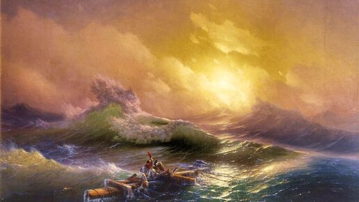 Иван Айвазовский. Девятый вал. 1850 г. Русский музей, Санкт-Петербург. Девятый вал – самая известная картина Айвазовского. Она была признана шедевром в первый же день выставки в далёком 1850 году. Люди приходили посмотреть на неё по несколько раз. Легенда о девятом вале была очень популярна в 19 веке. Моряки верили, что во время шторма девятая по счёту волна – самая большая и разрушительная. С ней и встретились герои картины. 6 несчастных моряков. Они цепляются за жизнь в бушующем море. На куске мачты погибшего корабля...
