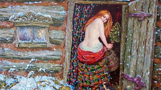 В русской бане люди могли провести даже не час – бывает, парились по полдня, выпивая хмельные напитки и закусывая. Конечно, для крестьян это было недоступно, но в банях и они мылись по меньшей мере раз в неделю – пятница считалась банным днем. А накануне свадьбы и во время родов в банях так вообще проводились целые ритуалы. Фирс Журавлев изобразил 12 женщин разных возрастов, которые очень похожи на богинь, празднующих какой-то свой праздник. Здесь живописное и в каком-то смысле загадочное помещение, с одной стороны, вовсе не похожее на баню – пол как будто в коврах, люстра на потолке...