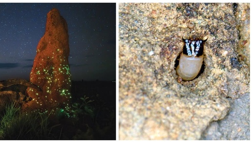 Это место можно было бы назвать мистическим – так завораживающе оно выглядит. Но в действительности у сияющих в тёмное время суток курганов есть практическое объяснение. Представители семейства жуков-щелкунов Pyrearinus termitilluminans процветают по всему миру, строя разросшиеся гнезда и периодически нанося ущерб местным запасам пиломатериалов. В Бразилии они строят высокие башни из цементоподобной земли. Этот южноамериканский вид жуков из семейства Elateridae интересен и уникален в своём роде. Как имаго, так и его личинки обладают способностью к биолюминесценции...