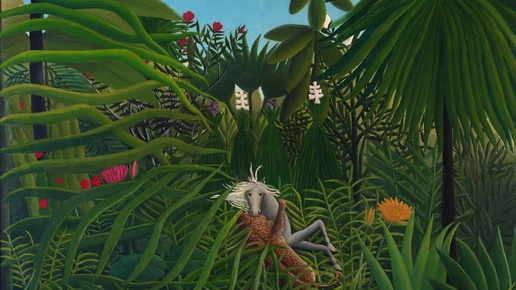Для родителей и школьников: Картину «Нападение ягуара на лошадь» написал французский художник Анри Руссо в 1910 году. Руссо никогда не был в джунглях и не видел настоящих тропических животных. Он придумывал свои картины, глядя на растения в ботаническом саду, открытки и книги. На картине мы видим тропический лес с огромными листьями и экзотическими растениями. В центре происходит драматическая сцена: ягуар (большая дикая кошка) нападает на лошадь. Ягуар вцепился зубами в шею лошади. Лошадь пытается вырваться, её глаза широко раскрыты от ужаса...