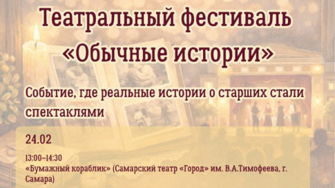 С 24 по 25 февраля на сцене драматического театра Самарская площадь состоится фестиваль независимых театров Обычные истории . В фестивале примут участие три театральных коллектива из Самары театр Город им. В.А. Тимофеева, театральная студия Родные души и ТАМ.Театр, а также Народный театр Муравей-НИК (с. Приволжье) и Молодежная студия Полукруг (г. Тольятти). Они покажут спектакли, прошедшие в финал: 24 февраля 13:00 14:30 Бумажный кораблик . Театр Город им. В.А...