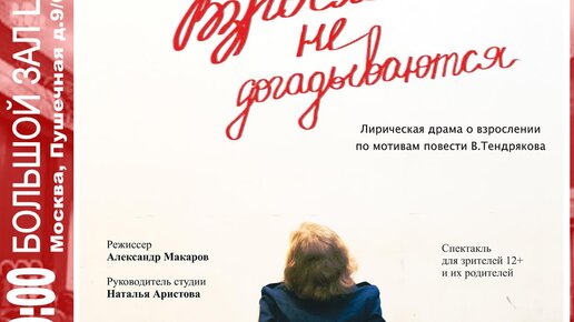Лирическая драма о взрослении по мотивам повести В.Тендрякова Режиссер — Александр МАКАРОВ Театр-студия «АРТЛИГА ЦДРИ» Руководитель студии — Наталья АРИСТОВА Спектакль предназначен для зрителей 12+ и их родителей Лирическая драма о взрослении, о том, как трудно признаться взрослым в чем-то личном, о том, как хочется, чтобы был тот, кто объяснил, что происходит в самые трудные моменты жизни. Спектакль о дружбе, любви и соперничестве. Все перемешивается, и судьба играет с героями в перевертыши...
