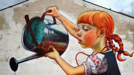 Впервые появившись в Польше, благодаря вездесущему интернету, эта милая девчушка уверенно отправилась по миру. Признаюсь, мне картинка настолько понравилась, что я поставила ее "обоями" на телефон, на ПК. Девочка поливающая "зеленое дерево денег" на фоне дома (недвижимости) удачно попадала" в тему" в пору моей риэлторской деятельности. А произвела на свет ее, польская художница Наталья Рак, широко известная своими уличными полотнами, в основном в стиле "фэнтези". Как унылая пятиэтажка прославилась на весь мир...