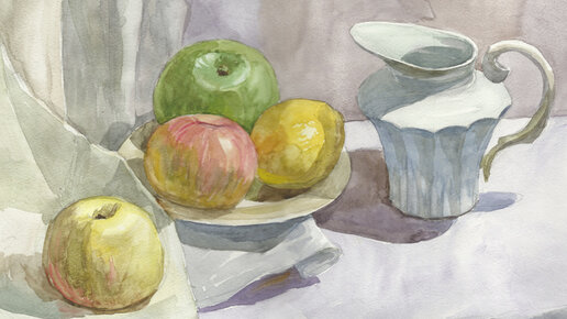 Несколько натюрмортов с фруктами. Это и натурные учебные постановки, и творческие работы, акварель. Оригиналы акварелей лежат где-то в папках, а фото - вот они. Скажу по секрету, мне кажется, что ровно кадрированные и уменьшенные, на экране компьютера, на белом поле, картины смотрятся даже выигрышно. Очень интересно писать виноград. Помогает приём "по-сырому"...