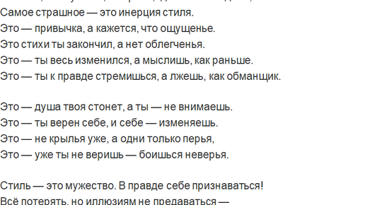 Хочу попрощаться с вами. Потому что, как говорится, – горбатого могила справит. Я не могу не думать о том,что произошло со мной несколько лет назад. И это время от времени прорывается в темах моих статей, постов. То есть, в моём случае речь идёт не только о самом горбатом – но и отношении как к самому, кого считают "горбатым", так и к тому, что он говорит и пишет, как к чему-то примитивному, не стоящему внимания. На последок (не знаю почему мне это важно?) хочу объясниться. Это стихотворение "Инерция стиля" я получила в подарок года...