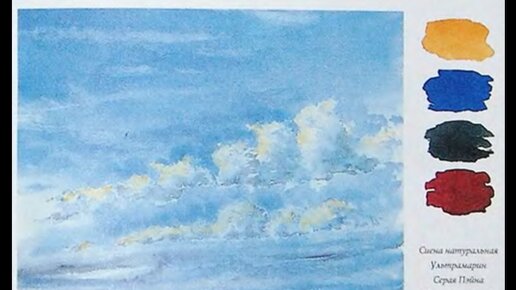 Кейт Фенвик: "Курс акварельной живописи" Небо - прекрасный объект для живописи. Чтобы изобразить его, требуется немного времени - менее трех минут. Небо определяет атмосферу и настроение в картине, и, поскольку часто оно занимает на ней не менее двух третей, очень важно написать его хорошо. В зависимости от состояния погоды небо создает атмосферу пейзажа. Бледное голубое небо, залитое солнечным светом, заставляет пейзаж сиять. Когда голубизна сменяется серым тоном, означающим приближение шторма, цвета пейзажа становятся тусклыми и хмурыми...