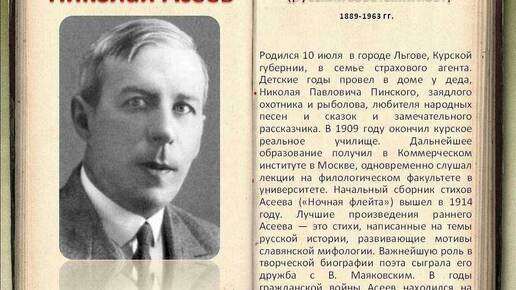 Николай Николаевич Асеев (фамилия при рождении — Ассеев, псевдоним — Николай Штальбаум; 28 июня [10 июля] 1889, Льгов, Курская губерния, Российская империя — 16 июля 1963, Москва, СССР) — русский советский поэт, переводчик и сценарист, деятель русского футуризма. Член союза «Председателей земного шара». Лауреат Сталинской премии первой степени (1941). Маяковский очень стремился объединить вокруг «Лефа» наиболее ярких писателей из тех, кто не боялся продешевить себя, сотрудничая в бедном средствами журнале...