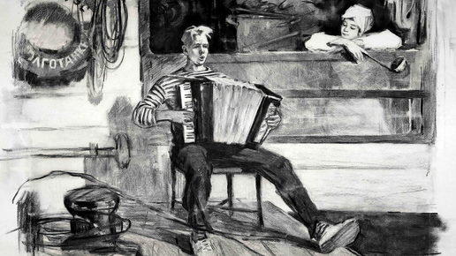 Гаврилова Нина Ивановна (15.08.1929, Иваново - 10.02.2004, там же). «Жестокие романсы». Из серии «По Волге». 1963 год. Бумага, уголь; 500 х 720 мм.; (Мордовский республиканский музей изобразительных искусств имени С.Д. Эрьзи). Какую песню поёт морячок? "И за орт ее бросает?" Меньшиков Владимир Михайлович (03.01.1933, Ленинград - 1994, С-Пб). «На танцы». Из серии «Сельские строители». 1980 год. Бумага, автолитография; 540 x 450 мм.; (Забайкальский краевой художественный музей, Чита). А были в деревнях такие колонки? Горяев Виталий Николаевич (01...