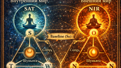 Я не пытаюсь «объяснить буддизм» и тем более не подменяю религиозно-философские смыслы инженерной схемой. Я делаю другое: я проверяю, можно ли в моём L3-языке описать ситуацию, когда один и тот же исходный материал опыта даёт два устойчивых результата, и оба результата непротиворечивы, но возникают в разных локах — то есть при разных множествах допустимых триад E_ℓ. Я беру две известные цели-узла: сатори и нирвану — и рассматриваю их как два типа «замыкания» (Cl_ℓ) одного и того же исходного материала...