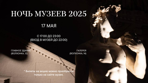 17 мая Пушкинский музей примет участие в акции «Ночь музеев». Музей можно будет посетить по билетам по специальной стоимости (100 рублей — постоянная экспозиция; 250 рублей — постоянная экспозиция и выставки). Завтра, 7 мая, в 12:00 откроется продажа билетов. Билеты можно будет приобрести на сайте, выбирайте тег «Ночь музеев». В каждое здание музея необходимо приобретать отдельный билет. Главное здание. Ночь музеев. Постоянная экспозиция+выставка «Подвиг музея» Главное здание. Ночь музеев. Постоянная экспозиция Галерея...