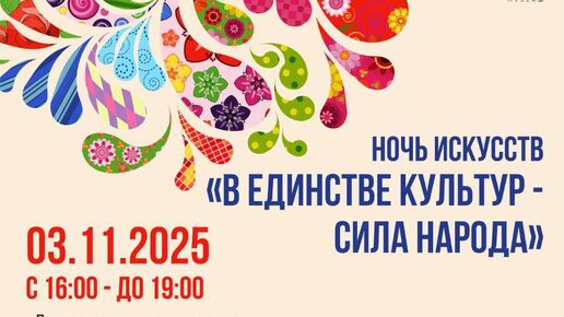 🎨 Ночь искусств в Ачинском краеведческом музее! 🗓 3 ноября 2025 года ⏰ с 16:00 до 19:00 📍 Ачинск, ул. Ленина, 20 и 20а ✨ Тема: «В единстве культур — сила народа!» Вас ждёт вечер творчества, традиций и вдохновения 🇷🇺 🧡 В программе: • Поэтическо-песенная площадка «Россия: в рифмах и песнях — единство сердец» • Чайная церемония нашей страны ☕ • Мастер-классы: – «Рукотворная Россия» (лепка пельменей) 🥟 – «Русские узоры. Палитра красок»...