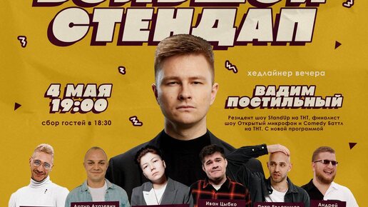 Ребята из стендапа уже второй раз делают Самый масштабный концерт в Сибири с не самыми медийными, но точно с самыми смешными комиками. Только, опытные, харизматичные и непохожие друг на друга артисты, зарядят вас на все майские праздники. Самые смешные люди из Новосибирска, Омска, Барнаула, Новокузнецка и даже Казахстана на сцене Театра Металлургов. 🔥Хедлайнер Вечера - Вадим Постильный! Смешнейший человек с хитрым взглядом и острым...