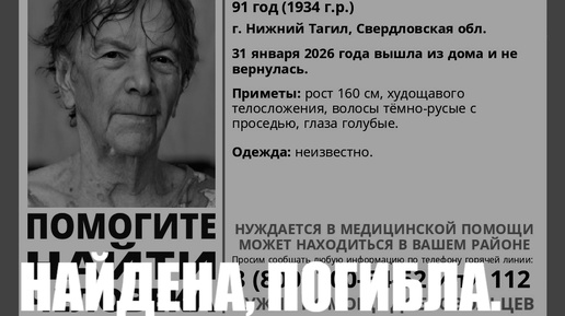 В Нижнем Тагиле завершены поиски 91-летней Нины Фесвитяниновой. Ее тело обнаружили недалеко от дома – в соседнем дворе, пожилая женщина не перенесла холодов, рассказали ИА «Все новости» в поисковом отряде «ЛизаАлерт». Нина Владимировна пропала 31 января: родственники пришли проведать бабушку, но не застали ее в квартире...