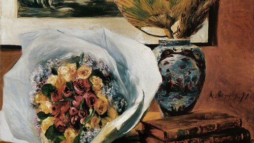 Легкие деньги. Как их заработать, когда ты бедный художник конца XIX века? Натюрморты Ренуар писал быстро, складно и в качестве медитативного отдыха. «Если бы я продавал только хорошие картины, я бы умер с голоду» - говорил художник. Со временем Ренуар отточил мастерство написания натюрмортов до непреодолимых высот, но в 1871 году он еще молод и находится в неустанном творческом поиске. «Натюрморт с букетом и веером» - особенный натюрморт, скрывающий в себе признание и дань уважения главному революционеру живописной среды - Эдуарду Мане...