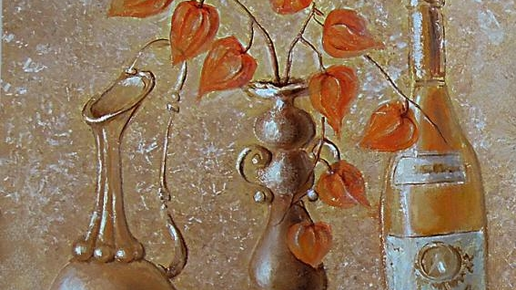 Весь натюрморт выполнен в одной цветовой гамме, теплой и в то же время блестящей, сверкающей, отличаются только оттенки (самые яркие – коробочки физалиса), и это придает натюрморту особенную прелесть...