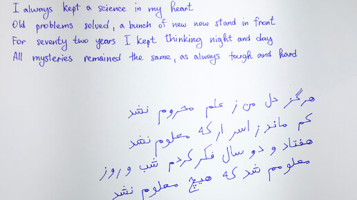 Гийяс-ад-Ди́н Абу-ль-Фатх Ома́р ибн-Эбрахи́м Хайя́м Нишапури́ (غیاث الدین ابوالفتح عمر بن ابراهیم خیام نیشابورﻯ), он же Омар Хайям (عمر خیام)?. Чтобы проверить себя "на прочность", я решил взяться, ни много ни мало, за собственный перевод одного из рубаи (رباعی) известного поэта, взяв за основу оригинальный текст XI века:. هرگز دل من ز علم محروم نشد کم ماند ز اسرار که معلوم نشد هفتاد و دو سال فکر کردم شب و روز معلومم شد که هیچ معلوم نشد . Роскошные переводы, предложенные для него ранее, имели один, неприемлемый на мой взгляд, недостаток...