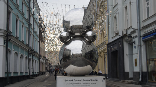 Месяца полтора назад я обещал показать вам интересную скульптурную композицию, установленную в Столешниковом переулке. Это пятиметровая "неваляшка" из отполированной до зеркального блеска нержавеющей стали. 2 фотографии (листайте галерею): Григорий Орехов, автор композиции, дал своему творению название "Агата". Так, Григорий выразил свою любовь к своей дочери - Агате...