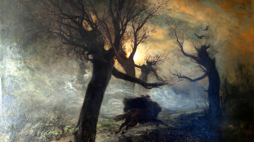 На этом полотне мы видим сумрачный лес в готическом стиле. Будто бы ожившие деревья преследуют одинокого всадника своими ветвями. Тот мчит на лошади во весь опор, прижимая к груди своего сына. При написании этой картины художник Юлий Клевер вдохновился балладой Иоганна Вольфганга фон Гёте, написанной в 1782 году. Российским читателям она наиболее известна в переводе Жуковского. Сюжет баллады уходит корнями к датской легенде Ellerkonge, где главную роль играет некое мифическое существо эльфийского происхождения, которое является предвестником смерти...