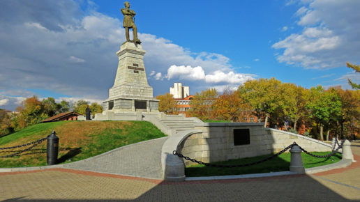 С вершины Амурского утёса, этого фасада Хабаровска, вглядывается в непокорённую даль сам Николай Муравьёв-Амурский, этот "Пётр I Дальнего Востока".