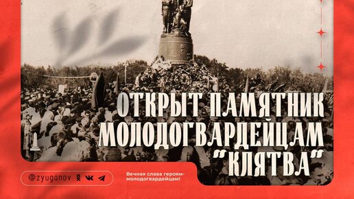 Монумент «Клятва» изображает волнующий момент, когда юные герои-антифашисты - члены штаба «Молодой гвардии» дают клятву верности своей Родине и борьбе с врагом. Крепко держит древко знамени Олег Кошевой, прислонила краешек полотнища к своему пламенному сердцу Ульяна Громова, внутренне подготовилась к...