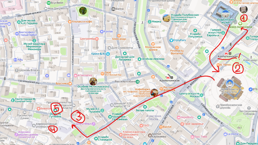 Здравствуйте! Данная статья является моей практической частью мой проектной работы - пешим путеводителем, который охватывает несколько периодов развития ретроспективы античного в Москве, от классики до модерна, карманная экскурсия включает в себя рассказ о пяти памятниках архитектуры расположенных на соседних улицах центра Москвы, путь от одного здания до другого не займет у вас много времени, но погрузит в интересный архитектурный период 19-20 веков. Вашему вниманию представлена карта нашего маршрута...