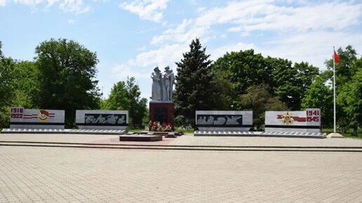 Мемориальный комплекс в Парке Победы — военный мемориал с барельефами, бронетехникой и фигурами солдат.