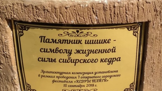 В городе Тайга установлен необычный памятник — памятник шишке. Он был торжественно открыт 15 сентября 2018 года в рамках первого городского фестиваля «Кедры Тайги». Находится в Юбилейном парке, рядом с Дворцом культуры. Автором идеи выступил В.М. Басманов, возглавляющий Совет народных депутатов Тайгинского городского округа и являющийся Секретарём Тайгинского местного отделения партии «Единая Россия». Имя скульптора, создавшего памятник, не указано. Каждый город и регион имеют свои уникальные черты...