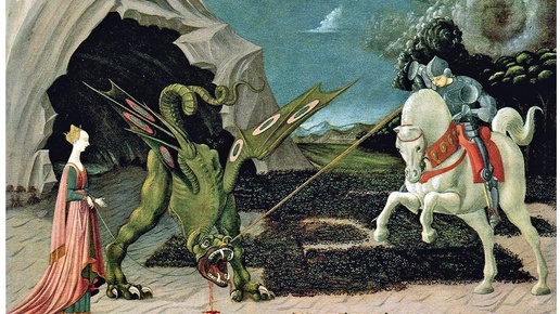 Все началось с этой картины — "Св. Георгий и дракон". Она очаровала меня. Посудите сами: необычный дракон, царевна, которую, теоретически, дракон собирался съесть, но которая выводит этого самого дракона из пещеры на веревочке, конь святого Георгия — подчеркнуто объемный, словно статуя, пещера, напоминающая своды готических соборов... И то ли тучи, то ли пыль за конем святого — совершенно потустороннего вида! Оторвать от этой картины глаз было невозможно. И я запомнила имя художника — Паоло Уччелло...