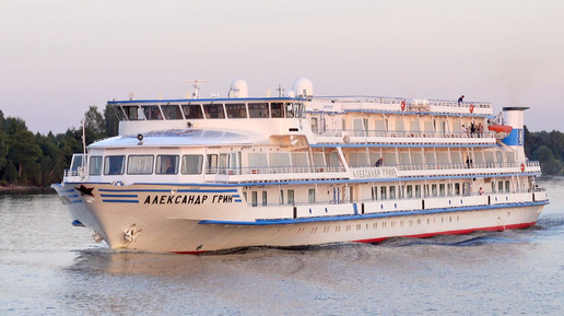 Роскошный речной круизный лайнер «Александр Грин» медленно шел по Волге, его белоснежный корпус сверкал на закате. Пассажиры круизного лайнера стояли на балконах, наблюдая, как небо превращается в полотно розового, оранжевого и коричневого цветов.