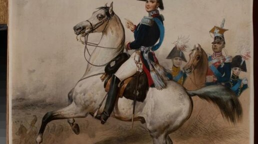 В коллекции Государственного музея-заповедника «Павловск» есть акварельный портрет императора Александра Павловича верхом в сопровождении также конной свиты. Автором его является, по данным самого музея, «Адам (Adam) Виктор». Насколько я понимаю, речь идет о французском художнике Жане Викторе Адаме (1801-67). В Госкаталоге музейного фонда РФ к произведению приложено следующее описание: «На первом плане, на гарцующем белом коне, изображен мужчина в военном мундире, шляпе с плюмажем; с лентой ордена Св...
