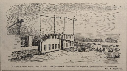 В газетах и журналах 1940-х -1950-х годов часто использовались рисунки художников вместо фотографий. В газете "Московский строитель" за 1951 год был опубликован рисунок художника-графика Германа Васильевича Перебатова (1928-2002), на котором изображено строительство жилого дома Министерства нефтяной промышленности. Это дом архитектора Н.В. Карташова, расположенный по адресу 5-я Парковая улица, д. 42. Художник смотрит на юг в сторону Измайловского бульвара...