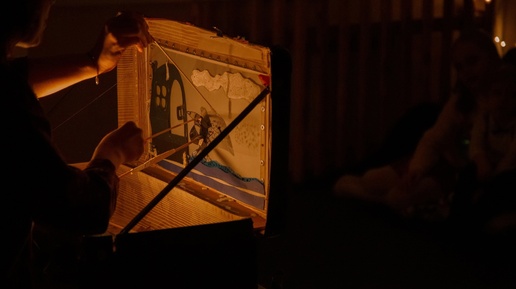 Художница Ольга Телицына ставит кукольные спектакли в 90-летнем чемодане. Он служит одновременно «домом» для кукол и главной декорацией – получается такой переносной театр, который всегда с собой. Чтобы показать представление, Ольга приносит чемодан в школы, детские больницы, на дни рождения. Ставит лампу — свет падает через окошко, проделанное в крышке чемодана, и картонные куклы на палочках оживают. Спектакли Ольга ставит по сказкам, которые нравятся ей и ее детям. Рисует декорации, персонажей, вырезает их из картона, крепит на палочки...