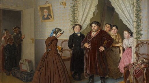 В 1866 году мастер бытовой живописи Василий Григорьевич Перов выставил свою новую работу на суд публики. Полотно с, казалось бы, безобидным бытовым сюжетом вызвало не просто интерес, а настоящий скандал. Одни зрители смущенно отворачивались, другие громко возмущались, третьи, преимущественно прогрессивная интеллигенция, видели в ней гениальную сатиру. Почему же эта, на первый взгляд, тихая сцена произвела такой эффект?.. Перов был мастером психологических портретов и социальных драм. "Приезд гувернантки...