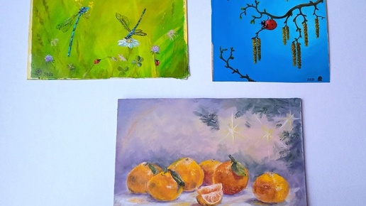 С картоночками маленького размера у меня связаны добрые воспоминания. Первые уроки, когда для разминки, перед тем как работать на холсте, мы смазывали льняным маслом обычный тонкий картон и затем на нём выполняли неуклюжий пейзаж. 2013 -й, спокойный и благополучный год. С тех пор мне очень сложно выбросить "отлично подходящий" картон в виде разных упаковок:) только сейчас я грунтую акрилом, а не маслом покрываю...